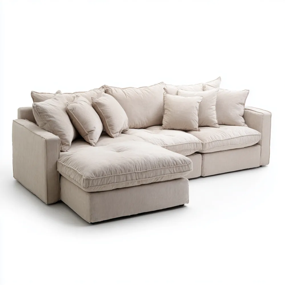 ProduitCe canapé d'angle confortable en tissu beige s'intègre parfaitement dans tout intérieur moderne. Parfait pour créer un espace accueillant dans votre salon.